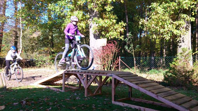 Když lávku všichni jezdili s prstem v nose, tak jsem jim postavil něco těžšího. Všimněte si, že na první lávce chybí poslední prkno a hlavně u druhé musí překonat asi 10 cm zub. Zde v akci Markéta, která svou odvahou vyprovokovala i některé váhající kluky.