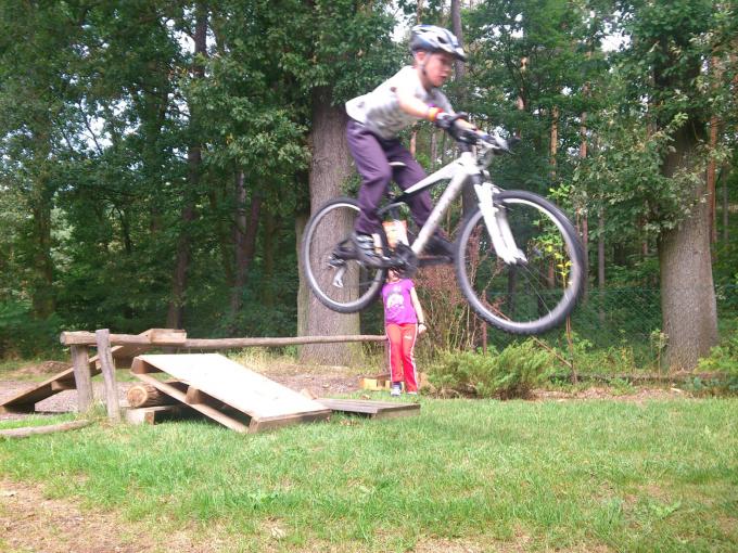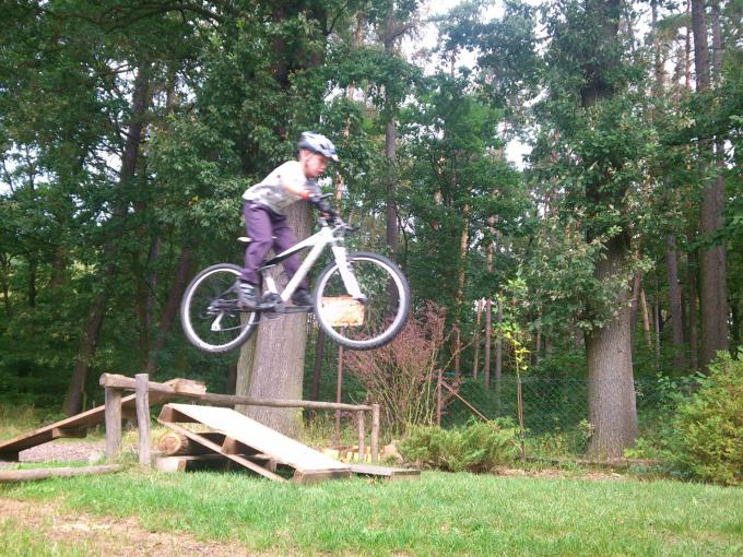 Vojta chtěl postavit trialovou překážku z palet. Jeden z nápadů (když bylo vše lehké) bylo položit paletu na "plůtek". Napoprvé měl strach. S každou úspěšnou jízdou si byl jistější a jistější. Tak začal dělat blbinky. Krátce na to poprvé skočil. Zde ještě nesměle.